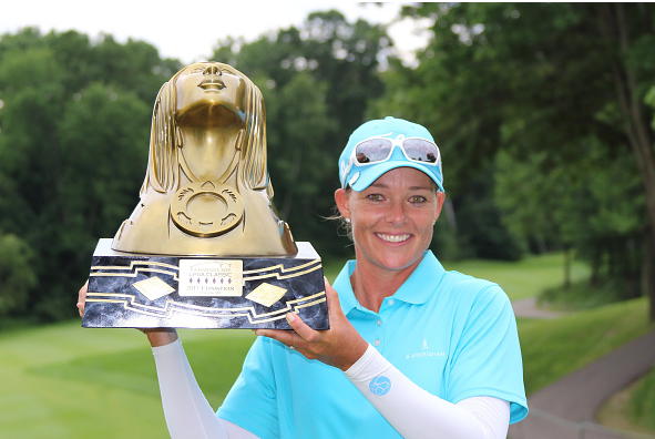 Katherine Kirk poses with the trophy after winning the 2017 Thornberry Creek LPGA Classic at Thornberry Creek at Oneida in Wisconsin. Credit: Kyodo News/Getty Images